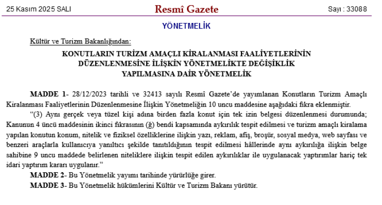 Yönetmeliğe eklenen fıkraya göre, turizm amaçlı kiralanan konutların konum, nitelik ve fiziksel özelliklerinin yanıltıcı şekilde tanıtıldığı tespit edilirse, belge sahibine tek bir idari yaptırım uygulanacak. Ancak bu, 9. maddede belirlenen diğer nitelik ihlalleri ile uygulanacak yaptırımları kapsamayacak.